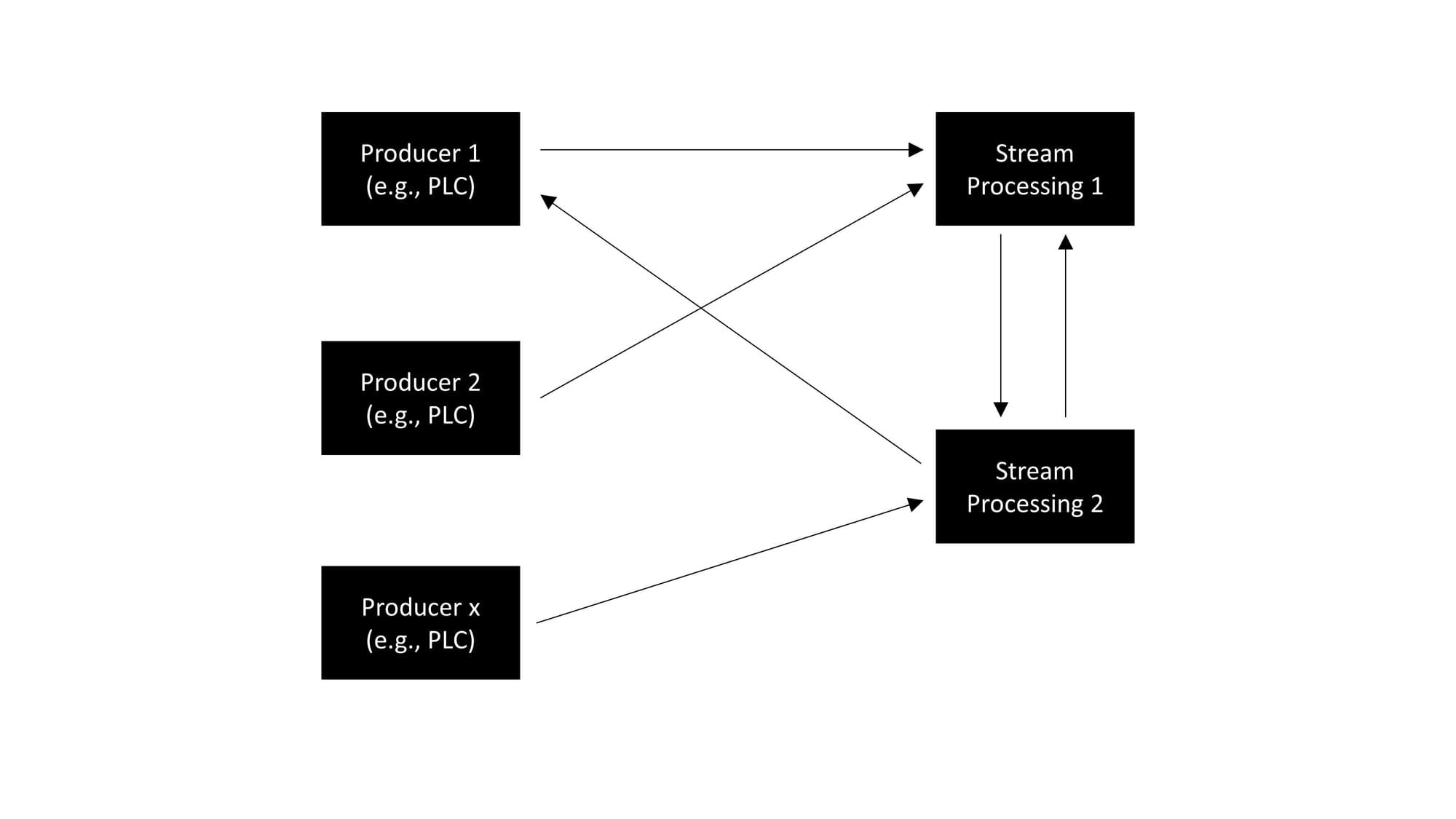 In this architecture, data producers such as PLCs are directly linked to various stream processing services. Each producer might send data to multiple services, and each service may receive data from multiple producers, creating a network of connections. This direct interaction enables real-time processing of data streams, as each service processes the incoming data as it arrives.