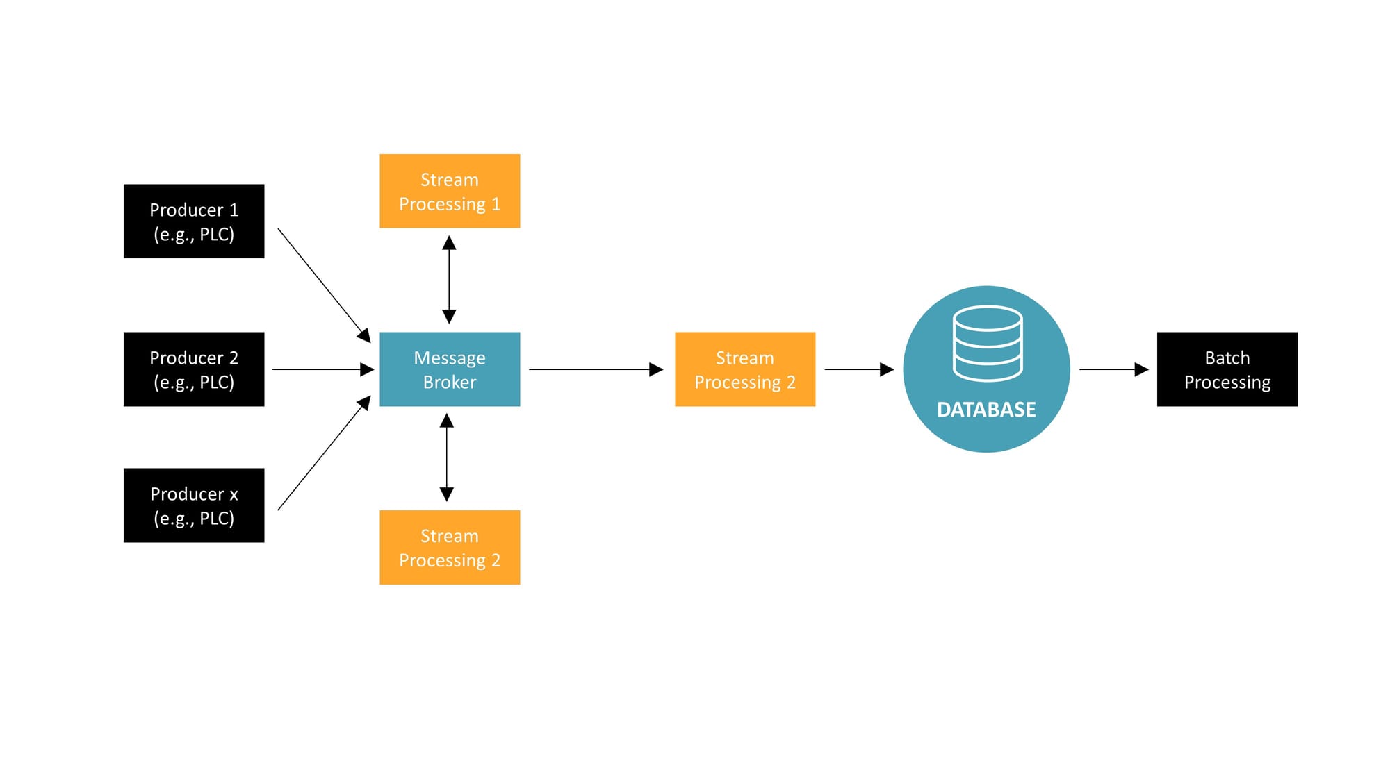 This architectural model introduces a message broker as the central hub for data communication, which greatly simplifies the data flow between producers and consumers. In the diagram, we see multiple data producers, such as PLCs, sending their data to a message broker. The message broker then distributes this data to various stream processing units based on subscription topics.