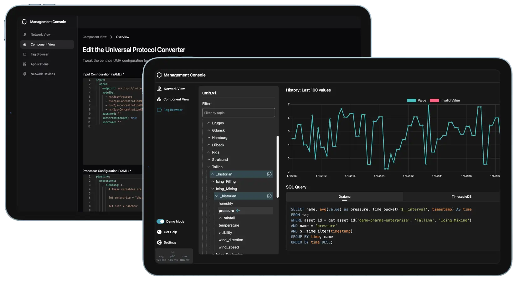 This gives both IT and OT have a good overview of the entire UMH architecture. The Management Console can either be configured in YAML (for IT) or by clicking around in its UI (preferred by OT). Metrics and logs can be analyzed with Prometheus (for IT) or using the "tag browser" in the UI (for OT). The tag browser gives an overview of real-time data that's being processed by the UMH.