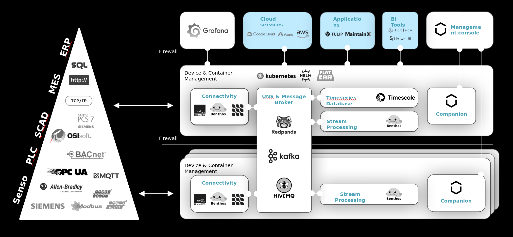 To counter this, the traditional solution in OT is to set up one or in the Purdue Enterprise Reference Architecture (PERA) even multiple demilitarized zones separated by firewalls. In the image below, the various layers of the automation pyramid (also called Purdue model) are separated by such firewalls. Unfortunately, these barriers make connecting the lower levels to the cloud much more difficult, often requiring multiple jump hosts, VPNs, or sometimes a combination of both. Therefore, it is made practically impossible to connect there, and usually OT engineers prefer a physical connection on the the factory floor itself.