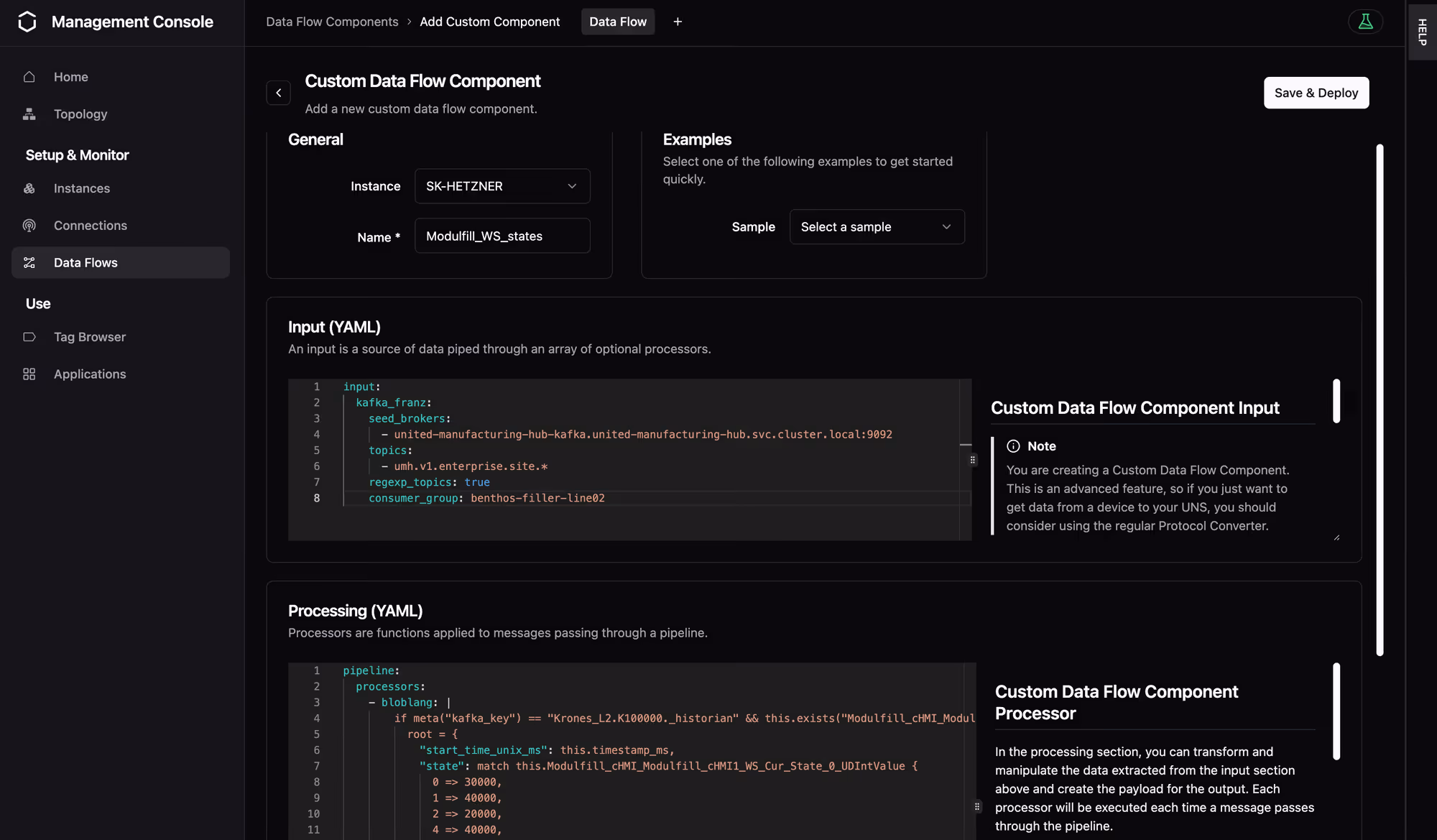 Explanation: This configuration connects to your Kafka broker to consume messages from specified topics, enabling real-time data ingestion from your machines.