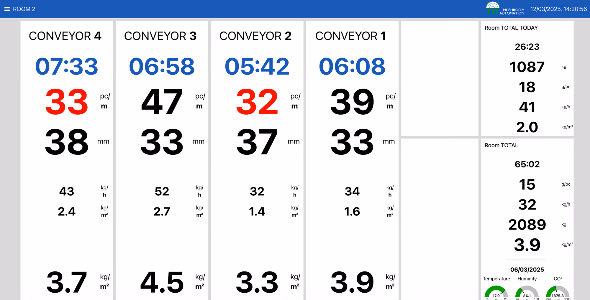An increase in the picking rate substantially reduces labor costs, often cited as up to 50% of production expenses in mushroom farming. With real-time dashboards, operators are more engaged, competing for higher yields and responding quickly to downtime or slowdowns.