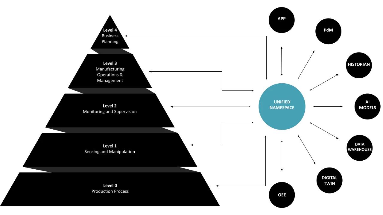 The UNS is described by Walker Reynolds as a framework where all applications and devices in Industrial IoT act as interconnected nodes, sharing and accessing data in a single unified location. Walker advocates for getting rid of the automation pyramid entirely, and making the UNS the governing system of the entire company.